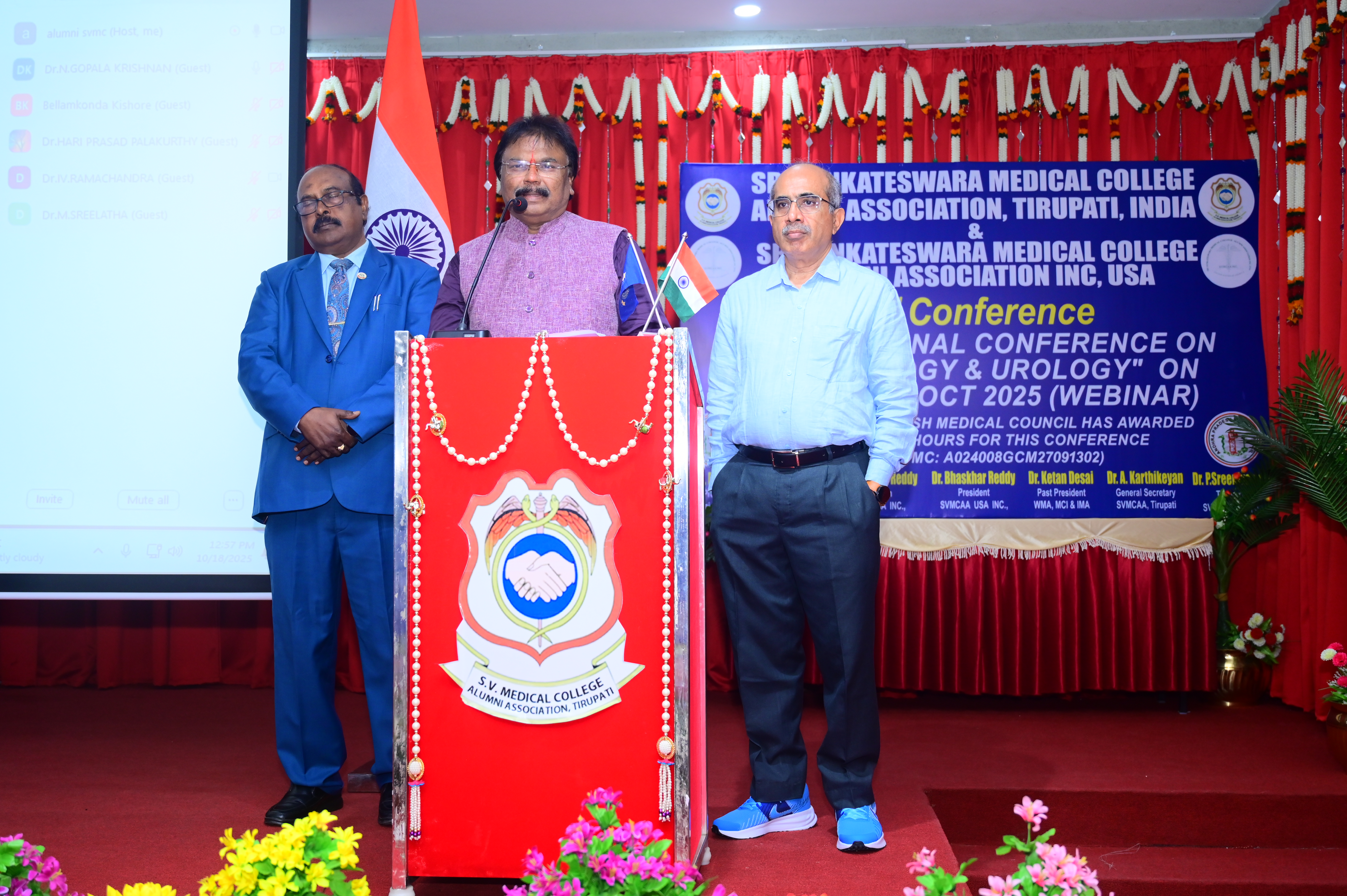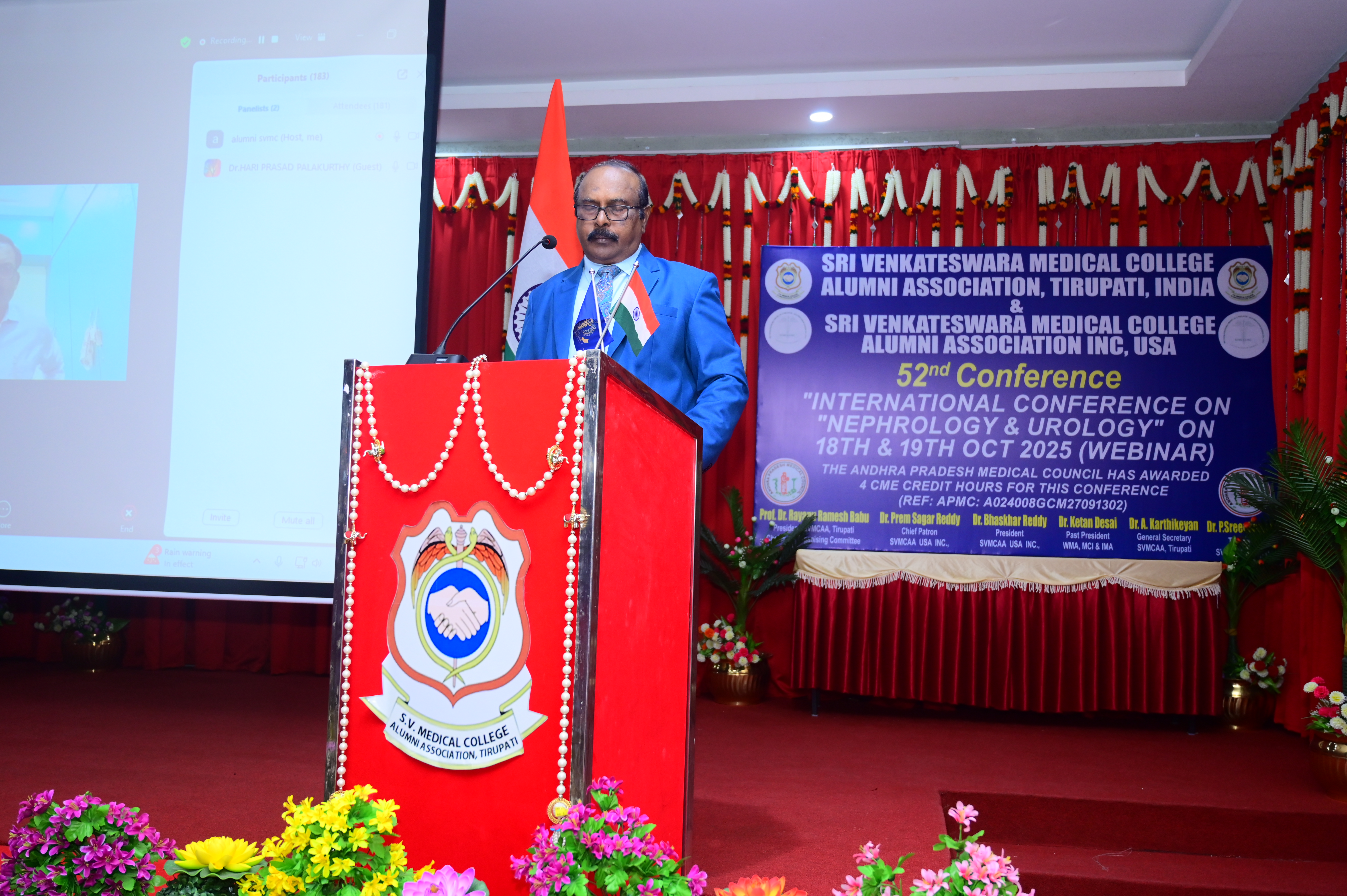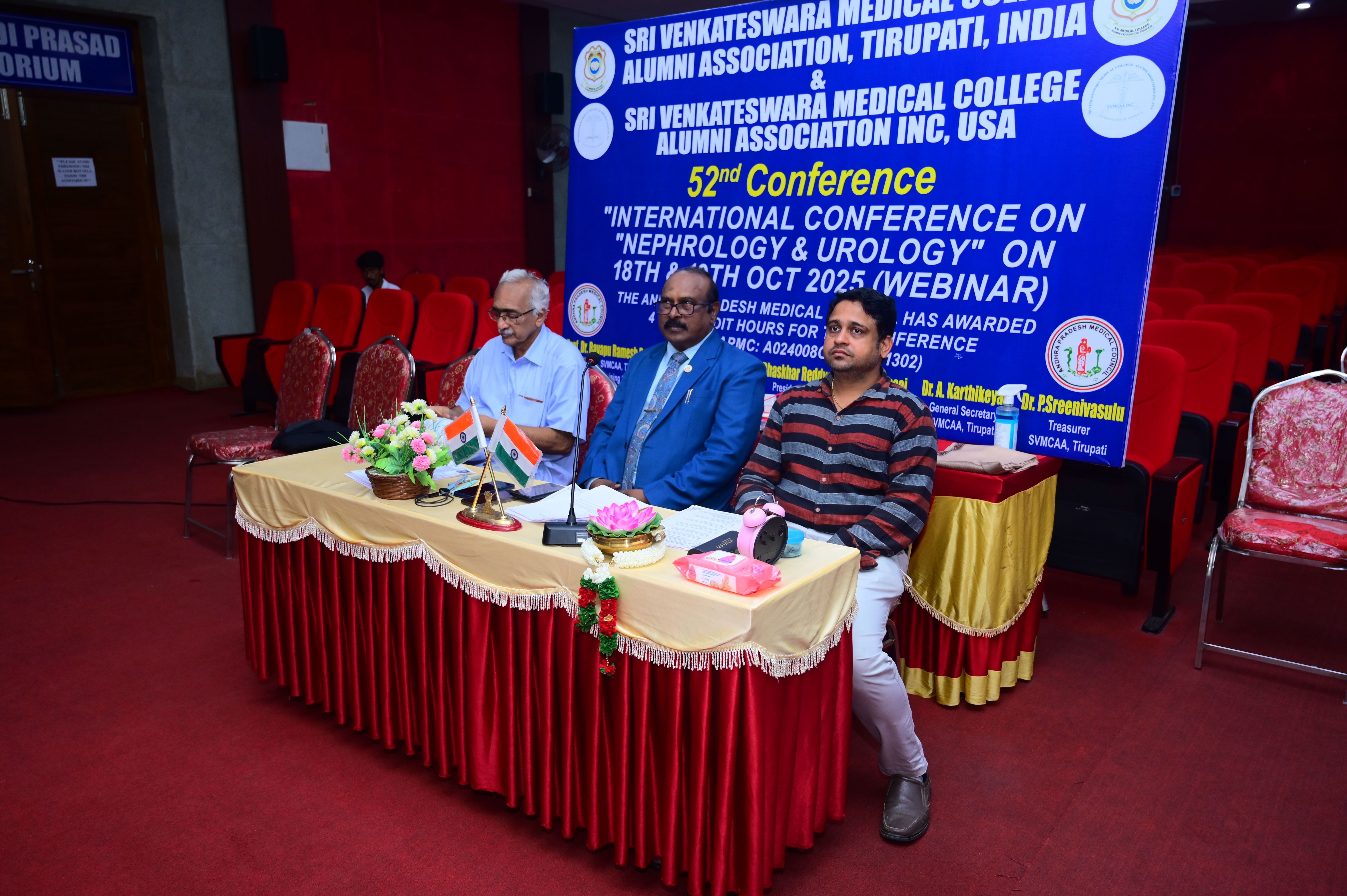 The 52nd International Conference on “Nephrology & Urology” was conducted as a webinar on the 18th and 19th of October 2025, from 9:00 AM to 6:00 PM on both days. This academic event featured 32 eminent speakers from India and abroad and was jointly organized by the S. V. Medical College Alumni Association (SVMCAA), Tirupati, and the S. V. Medical College Alumni Association USA Inc. The Andhra Pradesh Medical Council awarded 4 (FOUR) CME Credit Hours for this conference. Under the Chairmanship of Dr. Rayapu Ramesh Babu, President, SVMCAA, the conference was inaugurated by the Chief Guest: Dr. D. Sreehari Rao, Chairman, AP Medical Council, Other distinguished guests who participated included:2. Dr. I. V. Ramachandra Rao, Observer, APMC 3. Dr. Bhaskar Reddy, Urologist, Tirupati 4. Dr. C. Hithaishi, Nephrologist, Tirupati 5. Dr. A. Karthikeyan, Paediatrician and General Secretary, SVMCAA 6. Dr. Khader Faheem, Secretary, SVMCAA, Tirupati. The conference witnessed enthusiastic participation, rich scientific deliberations, and excellent knowledge exchange among experts
