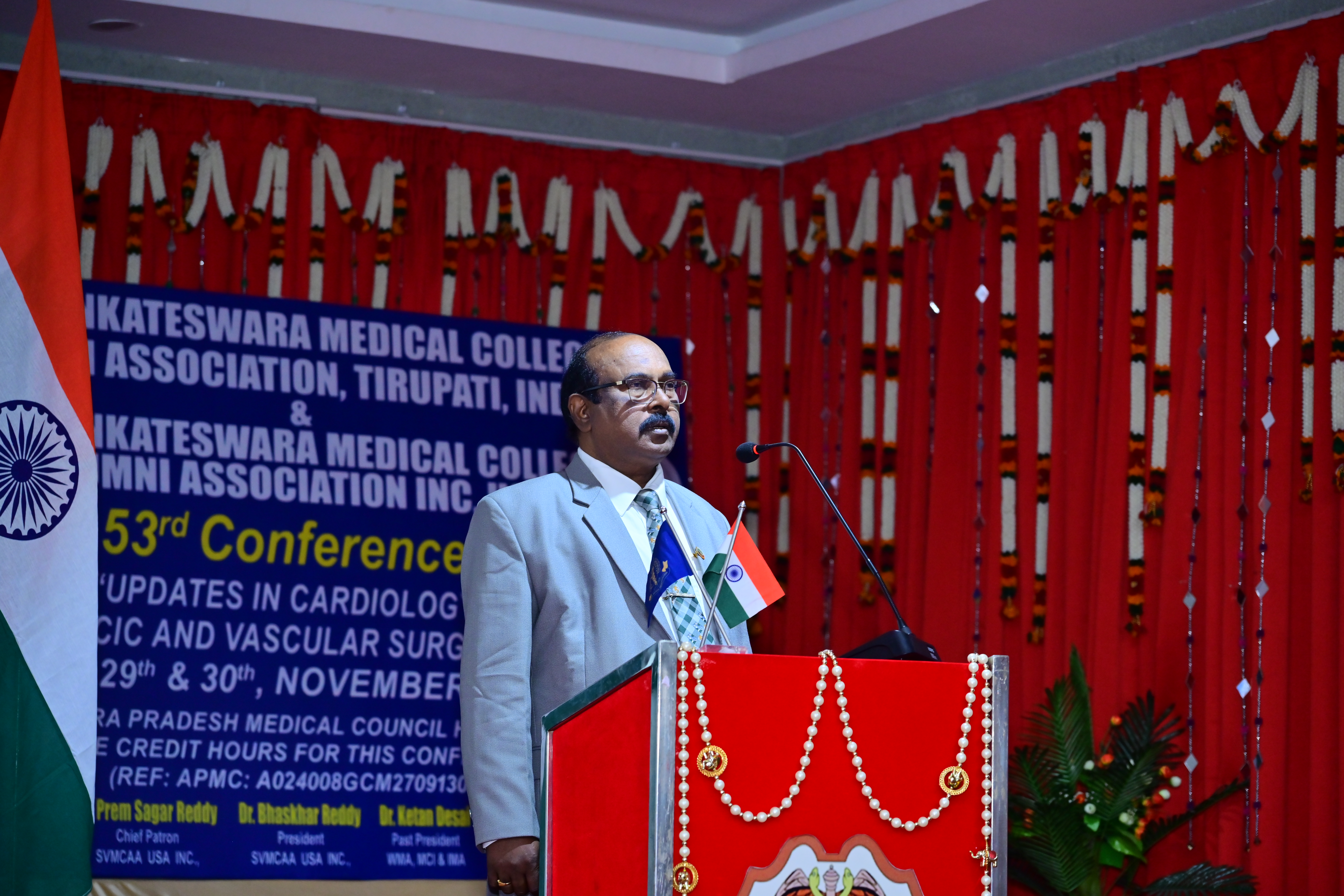 This is the information about the 53rdInternational conference - International Conference on “Updates on Cardiology – Cardiothoracic and Vascular Surgery” was conducted as a webinar on the 29th and 30th of November 2025, corresponding to the 18th & 19th sessions. The conference was held from 9:00 AM to 6:00 PM on both days. This prestigious event featured 32 renowned speakers from across India and abroad and was jointly organized by the S. V. Medical College Alumni Association (SVMCAA), Tirupati, and the S. V. Medical College Alumni Association USA Inc. The Andhra Pradesh Medical Council awarded 4 (FOUR) CME Credit Hours for this conference. Under the Chairmanship of Dr. Rayapu Ramesh Babu, President, SVMCAA, the conference was formally inaugurated by the Chief Guests: 1.Dr. Dilip Bhanushali, National President, IMA 2.Dr. D. Sreehari Rao, Chairman, AP Medical Council and other distinguished guests who graced the occasion included: 3. Dr. I. V. Ramachandra Rao, Observer, APMC 4. Dr. Nagaraja Kumar, Cardiologist, Tirupati 5. Dr. C. Venkataramana, Cardiologist, Tirupati 6. Dr. V. Vanajakhshamma, Cardiologist, SVIMS, Tirupati 7. Dr. G. Parthasaradhi, Vice-President, SVMCAA 8. Dr. A. Karthikeyan, Paediatrician and General Secretary, SVMCAA 9. Dr. Khader Faheem, Secretary, SVMCAA, Tirupati 10. Dr. G. Ravi Prabhu, Principal & ADME, Principal. SVMC, Tirupati 11. Dr. J. Radha, Superintendent SVRRGGH, Tirupati and 12. Dr. G. Prameela Devi, Superintendent, Govt. Maternity Hospital, Tirupati. The conference was a grand success, marked by excellent participation, high-quality scientific sessions, and valuable academic discussions.